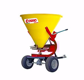 The COSMO PTP-PL Series Fertiliser Spreaders offer a simple and effective solution to spreading a range of fertiliser (pilled, granular or powdered) and seed (between 6 and 14m) without the need of a PTO. The heavy duty PVC hopper is UV stabilised, will not rust, is less likely to suffer from dints and scratches and is durable. The COSMO PTP-PL Series comes with a tow hitch allowing it to be connected to a range of machines (ATV, RTV, tractor and car). The twin lateral (side) exits provide the operator with left, right or full coverage spreading and also ensures uniformed spreading as the material drops straight onto the Stainless Steel six (6) vane spinner disc.