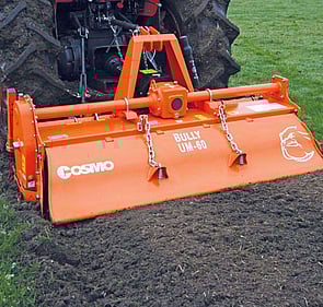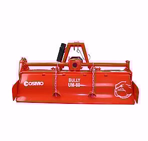 The European designed COSMO Bully UM Series Rotary Hoes are a single speed, side gear driven implement specifically for tractors in the 35 to 50hp range. Engineered to include multiple features and accessories traditionally found in much larger rotary hoes, the UM Series is suitable for use in nurseries, vineyards and orchards. The rotor features six (6) C shaped, heat treated blades (per flange) in a speed configuration. The speed configuration, a design where the blades are slightly staggered from flange to flange, reduces the horsepower required to produce a fine finish in a variety of soil conditions.